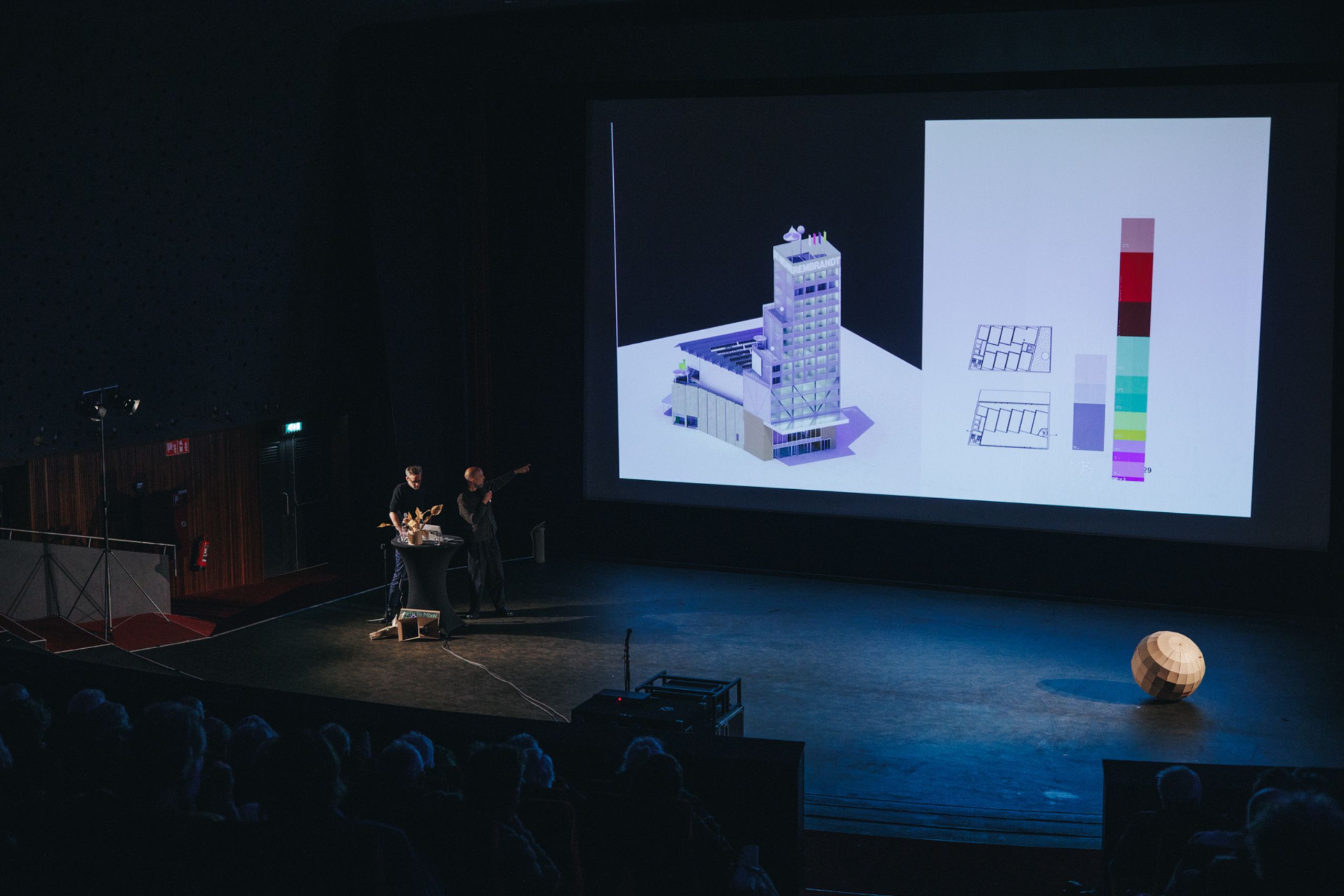 Architectenbureau 51N4E (Brussel) sluit hier naadloos op aan. Architect Johan Anrys legt uit waarom Schipper Bosch voor hun gekozen heeft voor Rembrandt aan de hand van de filosofie van het bureau niet. Belangrijk hierbij zijn niet slopen, maar aanpassen, architectuur als middel, niet als doel en het werken vanuit verhalen, gebruik en collectief proces. Anrys laat aan de hand van Brusselse voorbeelden (o.a. WTC-torens, Circularium, hergebruik van iconische gebouwen) zien hoe zij werken met tijdelijke programmering, activatie vóór het masterplan en hybride functies en hoe dit leidt tot levendige, duurzame plekken.Voor Rembrandt betekent dit dat de zaal wordt behouden als zaal, waarbij de de foyer wordt verplaatst om het gebouw opener en actiever te maken. Er komen meerdere entrees zodat het gebouw communiceert met de stad. Aan de voorkant worden dagelijkse functies gesitueerd (werken, exposities, etalages), aan de achterkant komt een nieuw foyerplein. Het panoramadek aan de voorkant wordt uitgebreid en krijgt een buitenruimte. Aan de achterkant komt een toren bedoeld voor verschillende verblijfsvormen (short stay, atelierwoningen) als